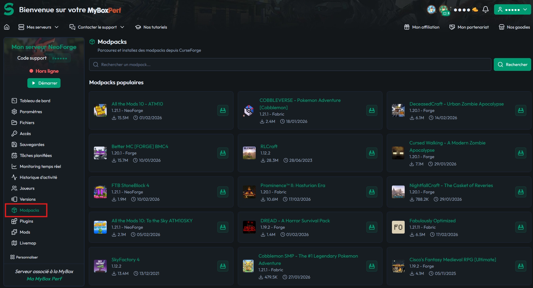 Depuis votre panel MineStrator, dans l'espace de gestion de votre serveur, rendez-vous dans lâonglet Modpacks.