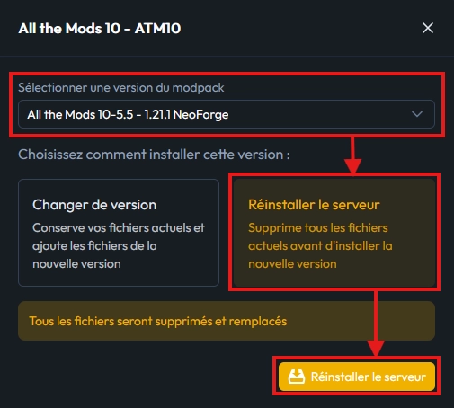 Choisissez la version du modpack, vĂ©rifiez quâelle correspond Ă votre client, puis cliquez sur RĂ©installer le serveur pour lancer lâinstallation.