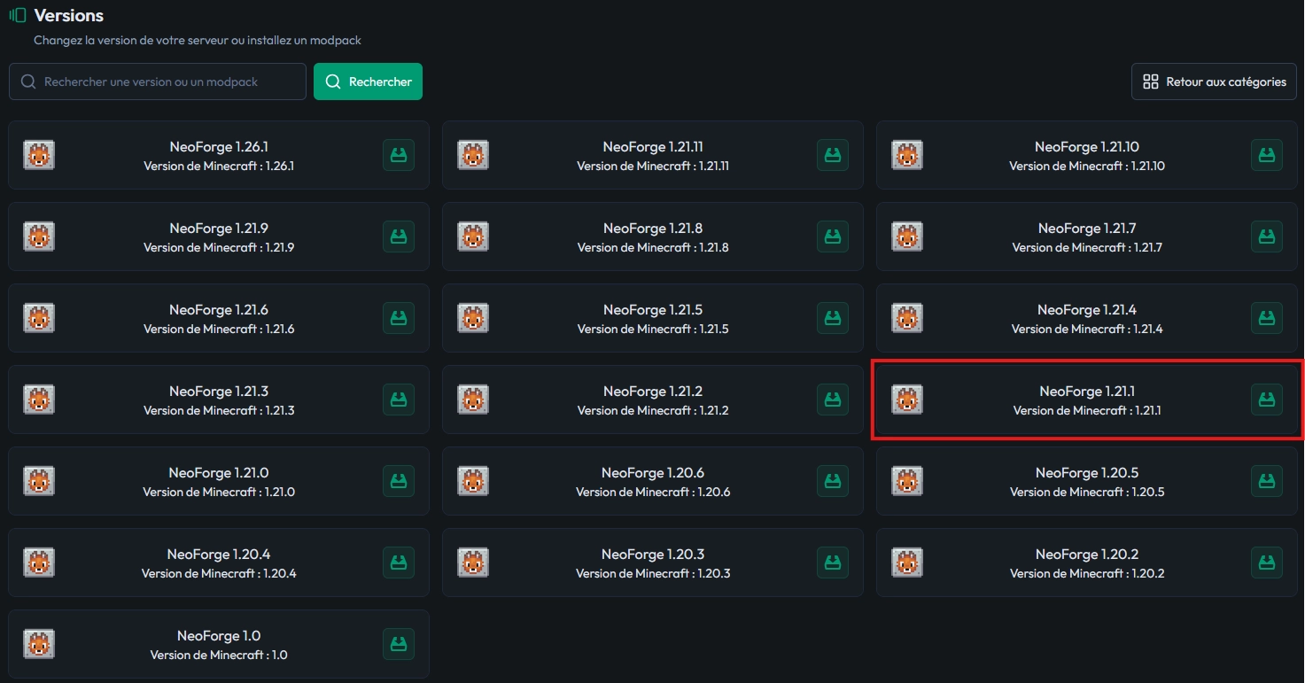 Dans lâonglet Versions, vous verrez tous les types disponibles (Vanilla, Forge, Fabric, NeoForge, etc.). SĂ©lectionnez NeoForge, puis choisissez la version en fonction des mods que vous visez.