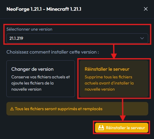 â ïž Attention : Changer de version dĂ©clenche une rĂ©installation du serveur. Sauvegardez votre monde depuis lâonglet Sauvegardes si nĂ©cessaire.