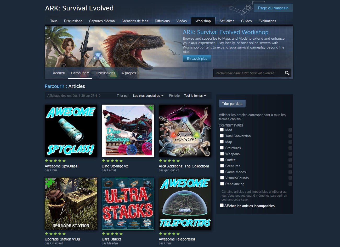 Rendez-vous sur le Steam Workshop d'ARK Survival Evolved depuis votre client Steam ou votre navigateur.