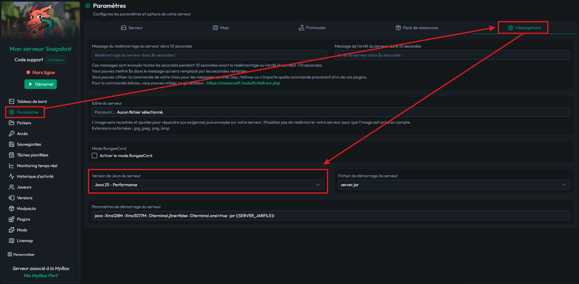 Dans votre panel MineStrator, ouvrez l'onglet Paramètres → Hébergement et sélectionnez la version Java correspondant à la snapshot que vous installez. Privilégiez toujours la version Performance. Consultez les patch notes officielles pour savoir quelle version est requise.