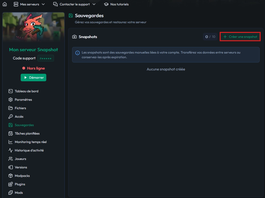 Avant toute manipulation, créez une sauvegarde depuis l'onglet Sauvegardes de votre panel MineStrator. Vous y trouverez le bouton pour "Créer une snapshot", attention à ne pas confondre avec les snapshots Minecraft, c'est simplement le terme utilisé par MineStrator pour désigner une sauvegarde manuelle de votre serveur.