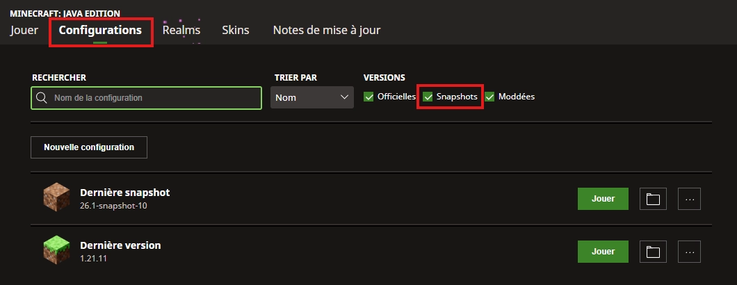 Ouvrez le Minecraft Launcher et accédez à l'onglet Configurations. Cochez le filtre Snapshots pour faire apparaître les versions de développement.