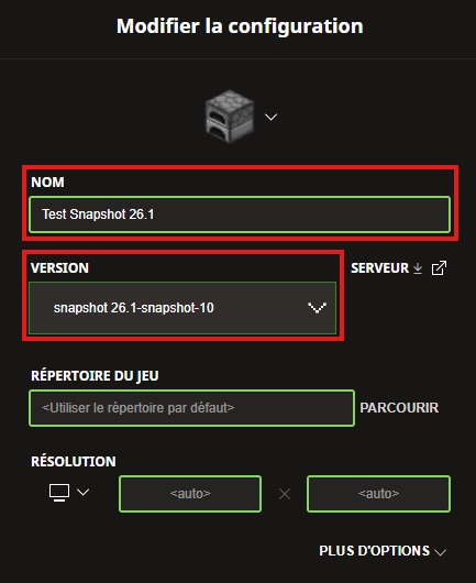 Cliquez sur Nouvelle configuration, donnez-lui un nom explicite (par exemple "Test Snapshot 26.1") et sélectionnez dans le menu déroulant la version exacte correspondant à votre serveur.