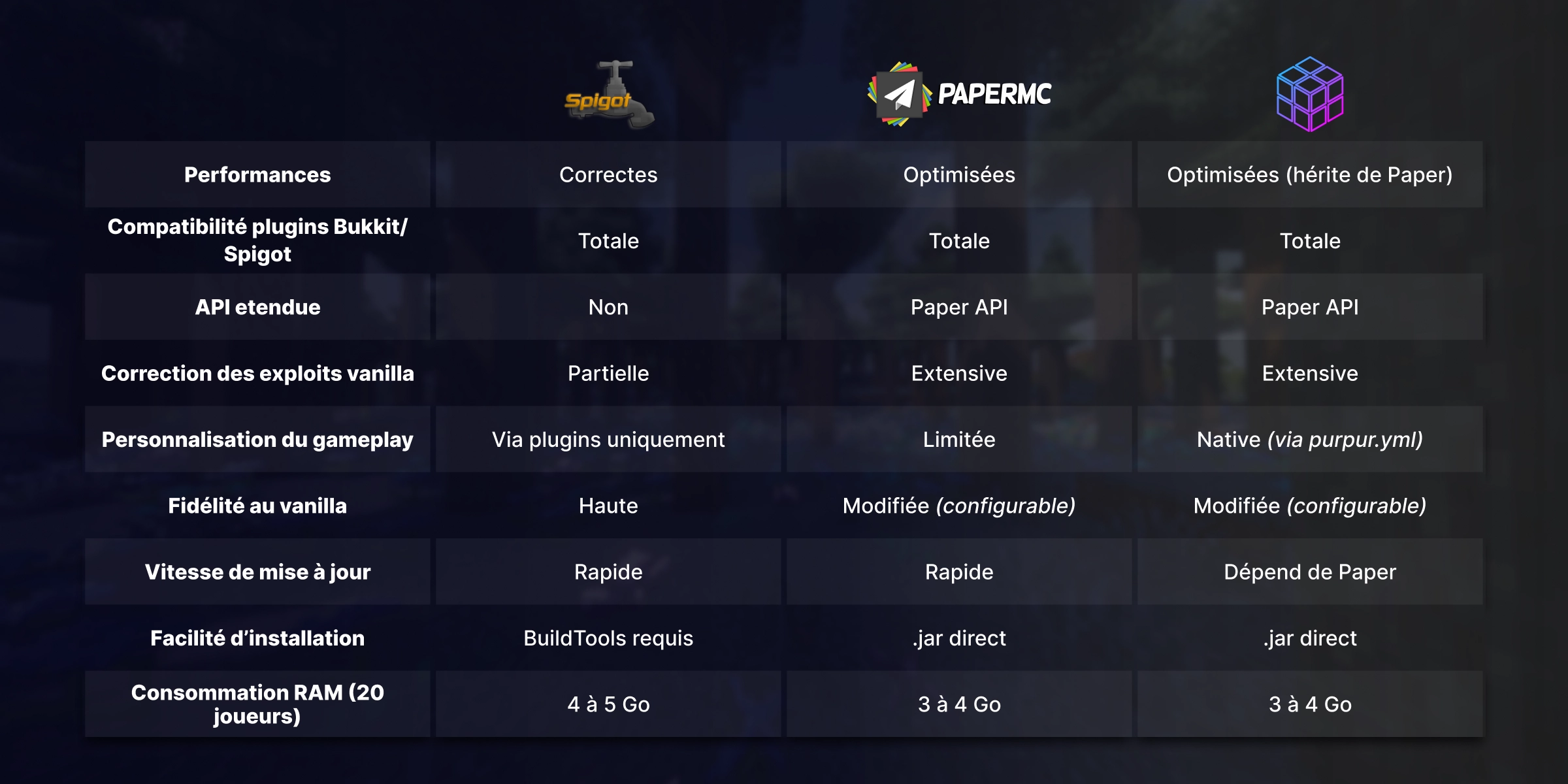 Tableau comparatif : Paper vs Spigot vs Purpur