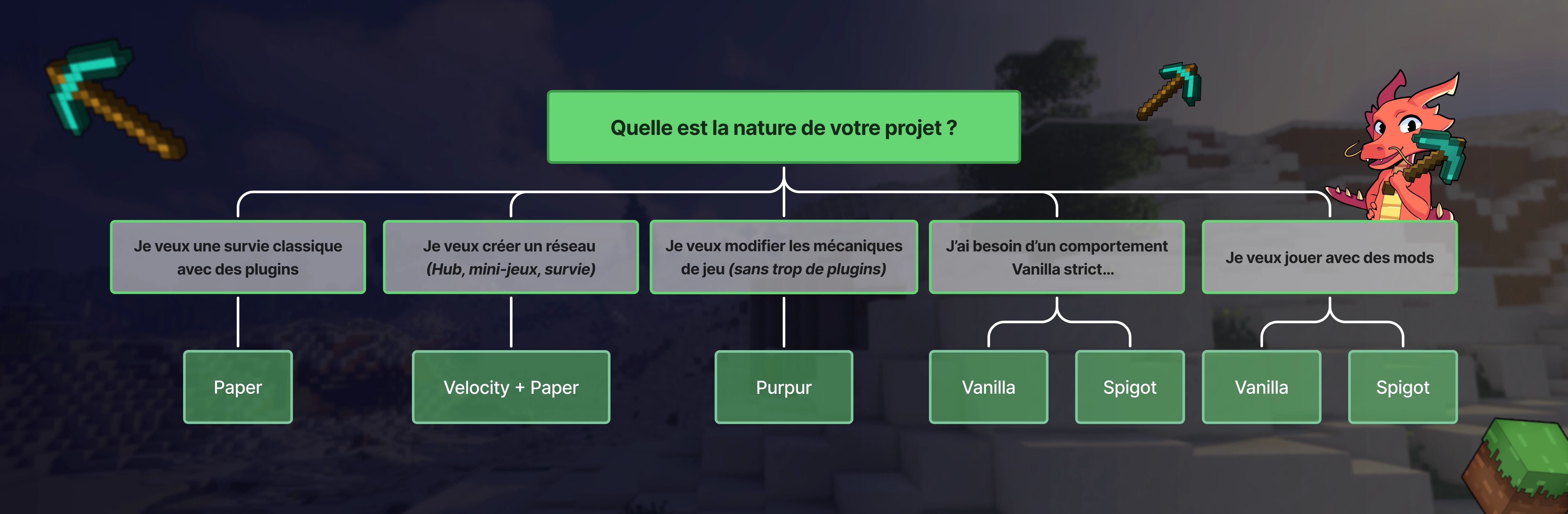 Vous avez besoin d'un comportement vanilla strict (redstone, fermes techniques) ? → Spigot, ou Paper avec les options vanilla réactivées dans la configuration. Vanilla si les mécaniques ne sont pas disponibles sur Spigot ou Paper.