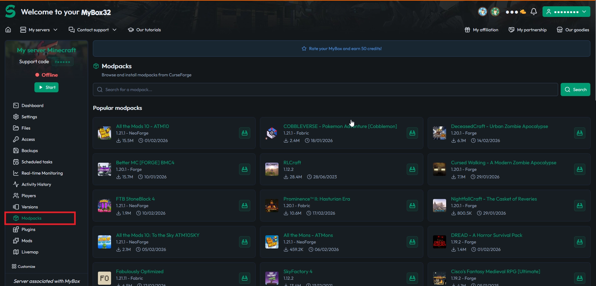 From your MineStrator panel, open your server management area and go to the Modpacks tab.