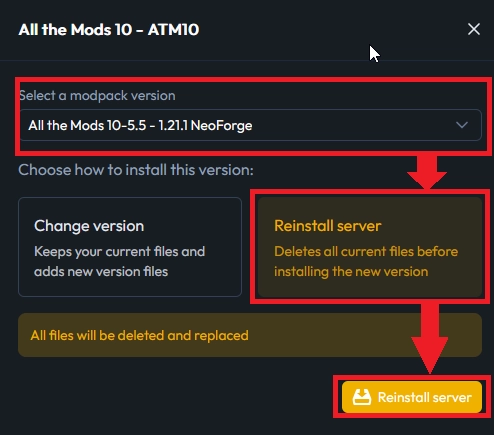 Select the modpack version, make sure it matches your client, then click Reinstall the server to launch the installation.