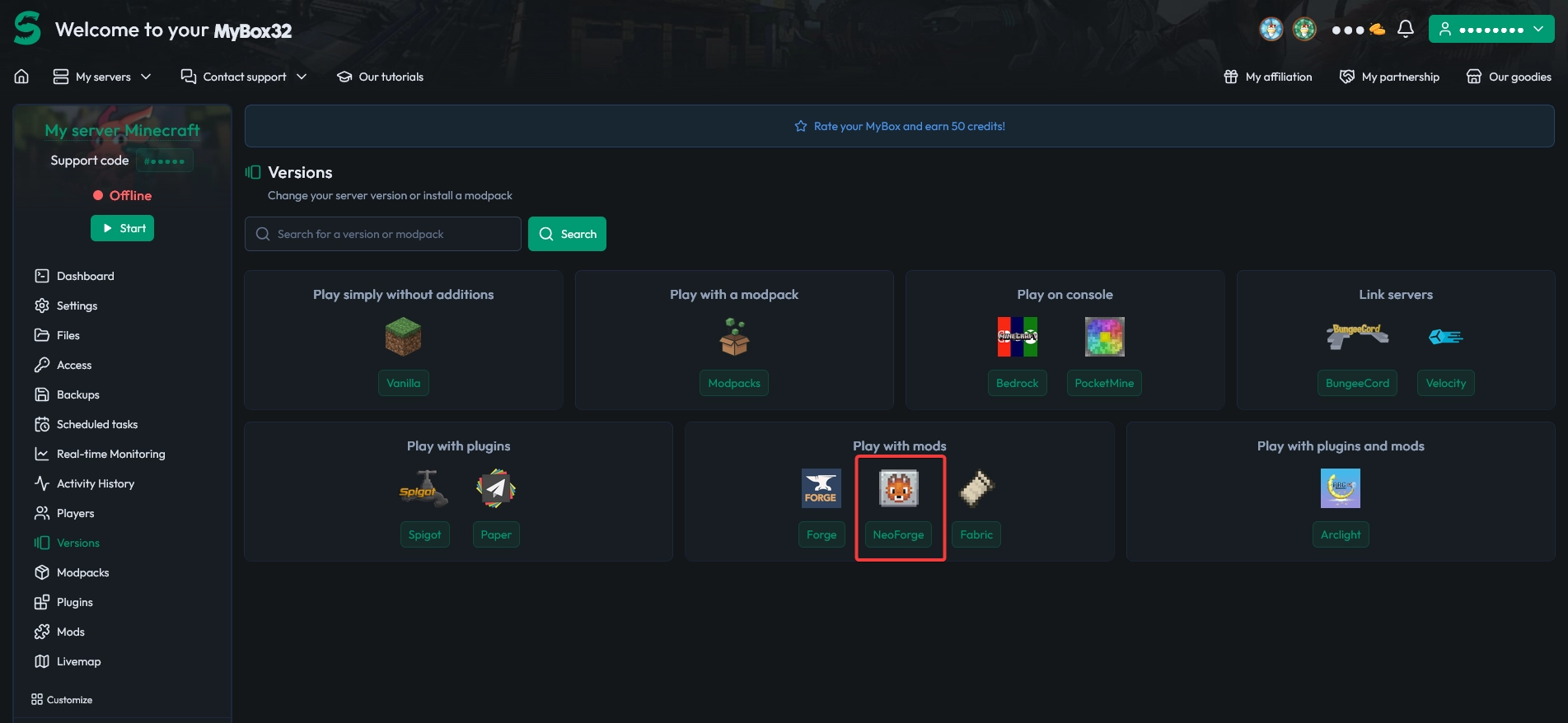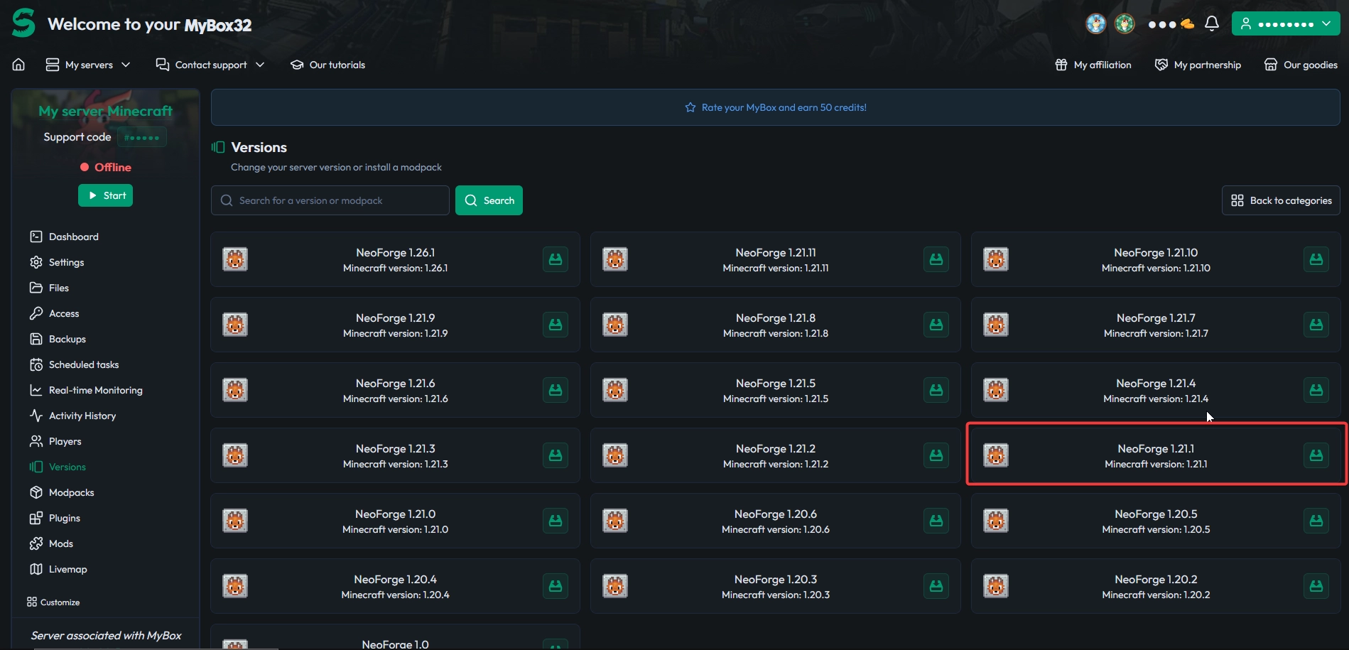 In the Versions tab, youâll see all available server types (Vanilla, Forge, Fabric, NeoForge, etc.). Select NeoForge, then choose the version that matches the mods you want to run.