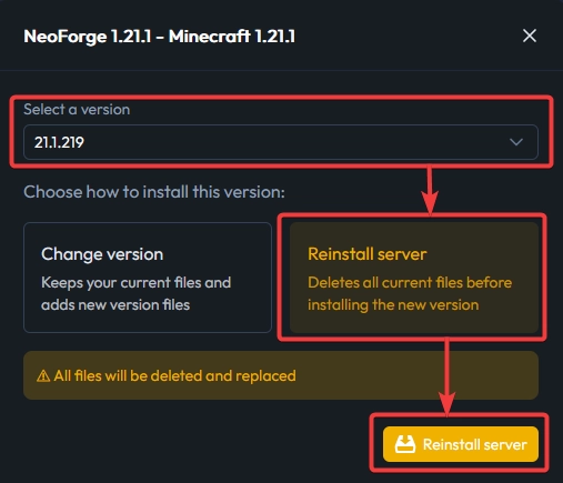 â ïž Warning: Changing the server version triggers a reinstall. Back up your world in the Backups tab if needed.