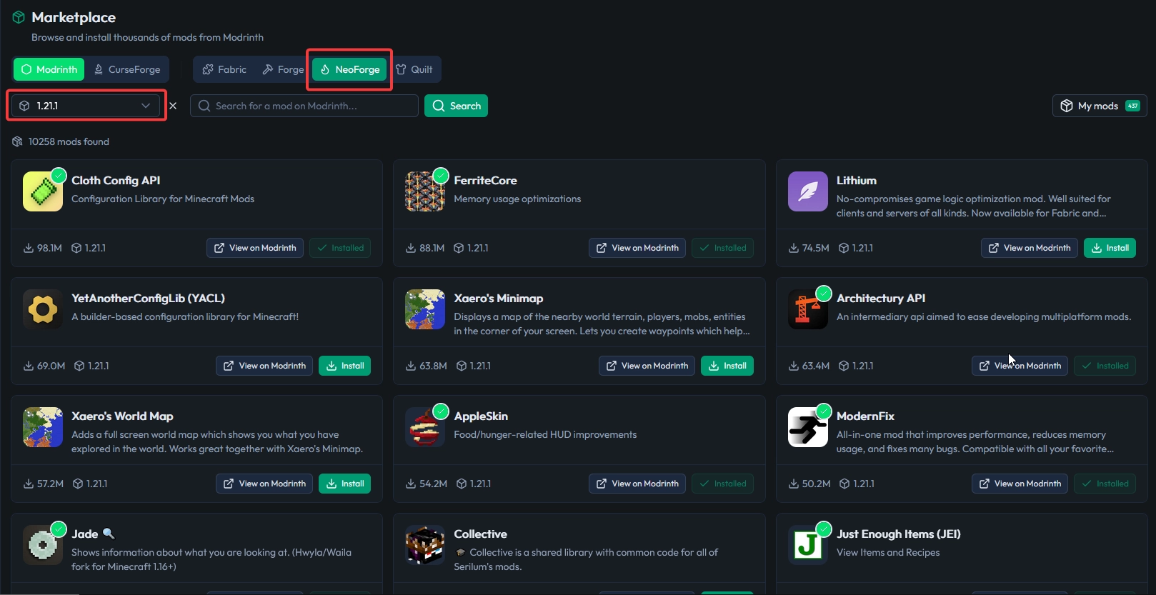 In the Mods tab, start by entering your Minecraft version (for example 1.21.1) and selecting NeoForge as the modloader.